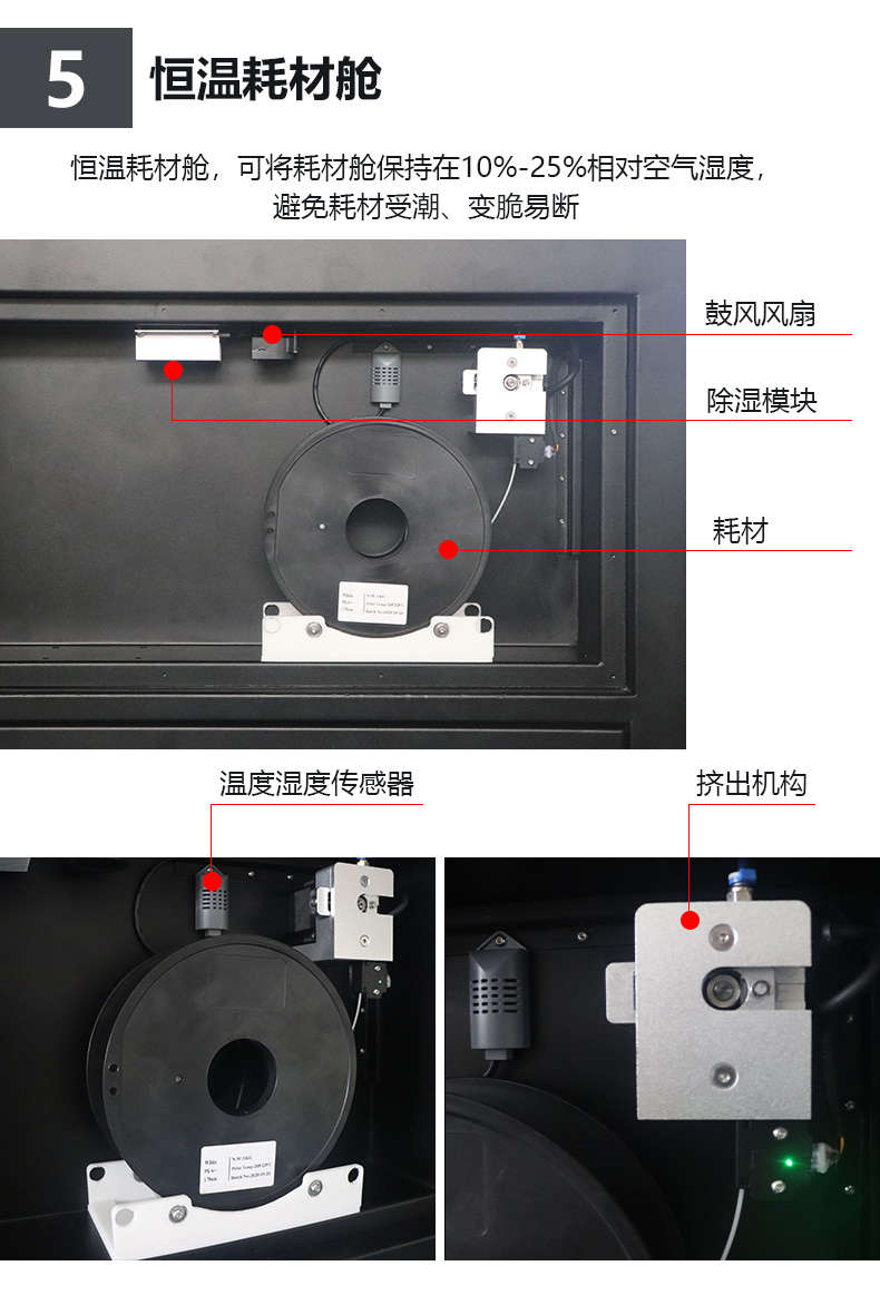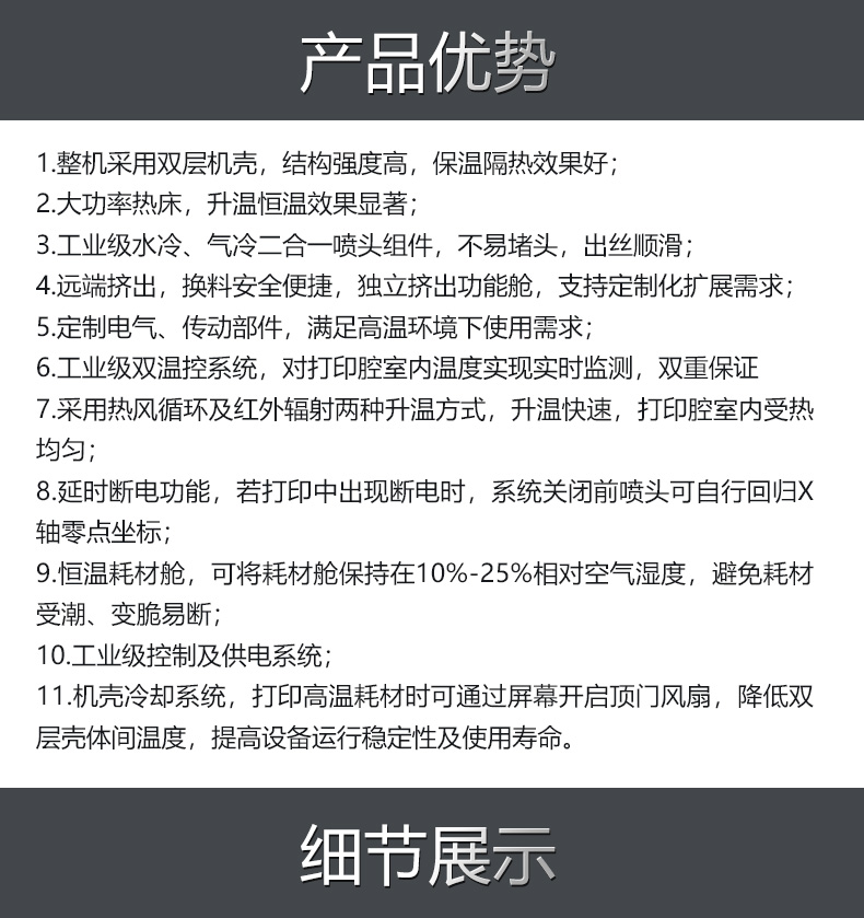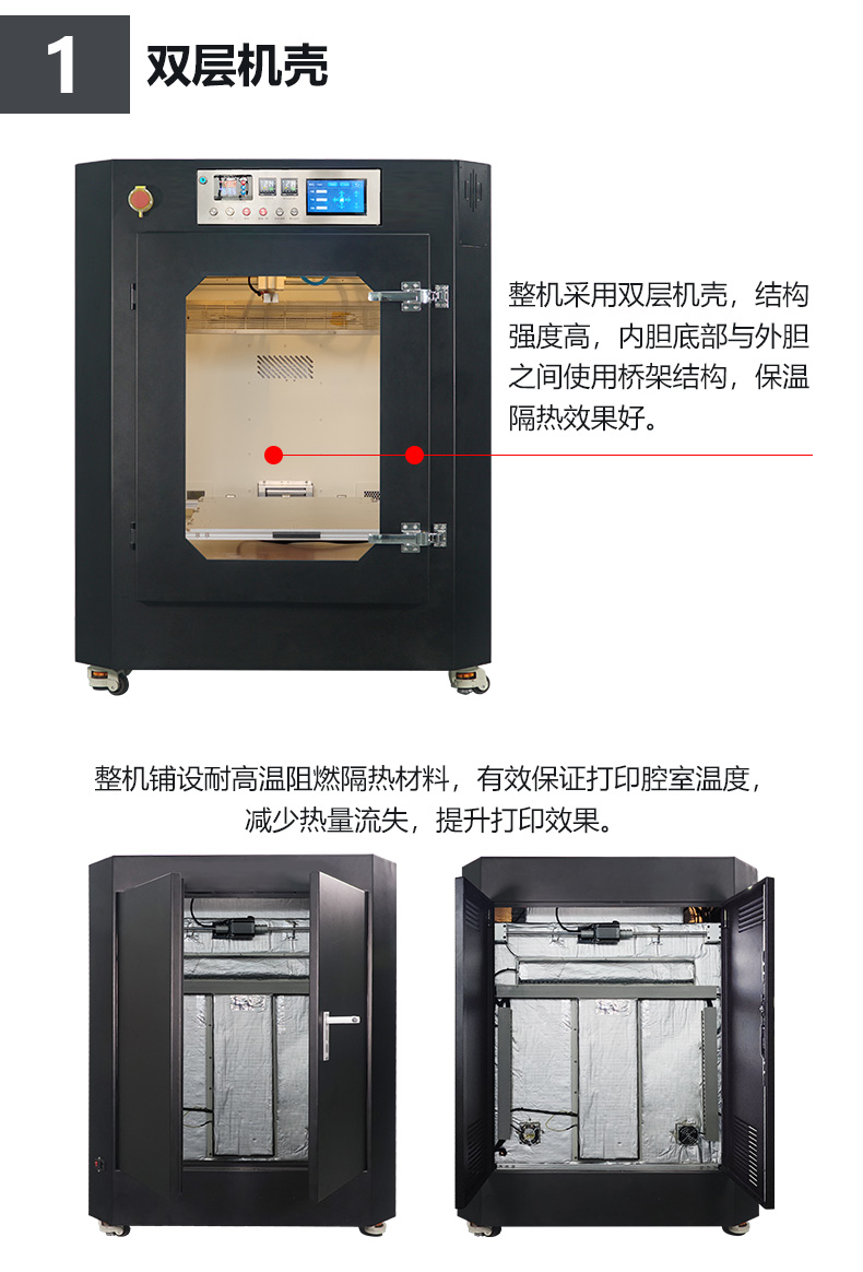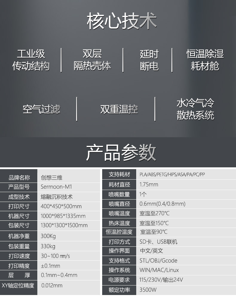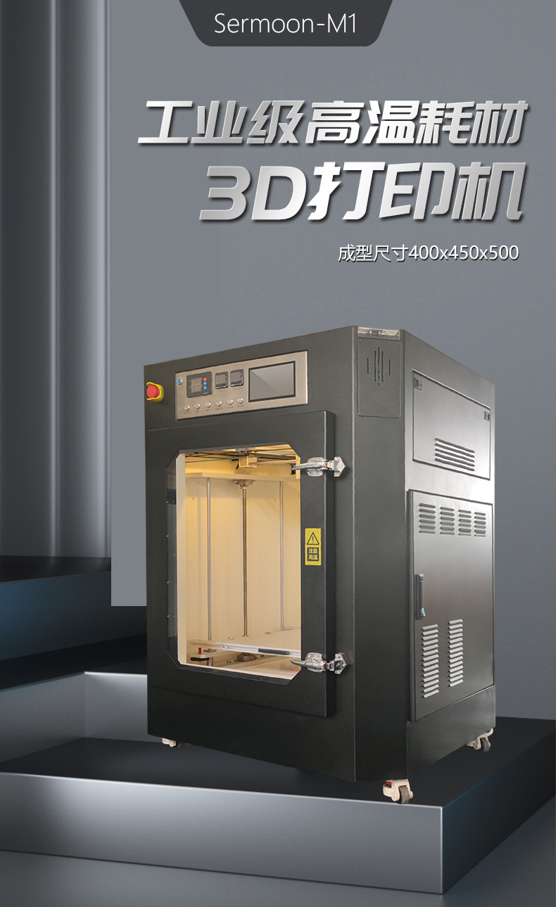 工業(yè)級 Sermoon-M1,成型尺寸:400X450X500mm;整機采用雙層機殼,保溫隔熱效果好;工業(yè)級水冷、氣冷二合一噴頭組件,不易堵頭,出絲順滑;定制電氣、傳動部件,滿足高溫環(huán)境下使用需求;恒溫耗材艙,可將耗材艙保持在10%-25%相對空氣濕度,避免耗材受潮、變脆易斷。