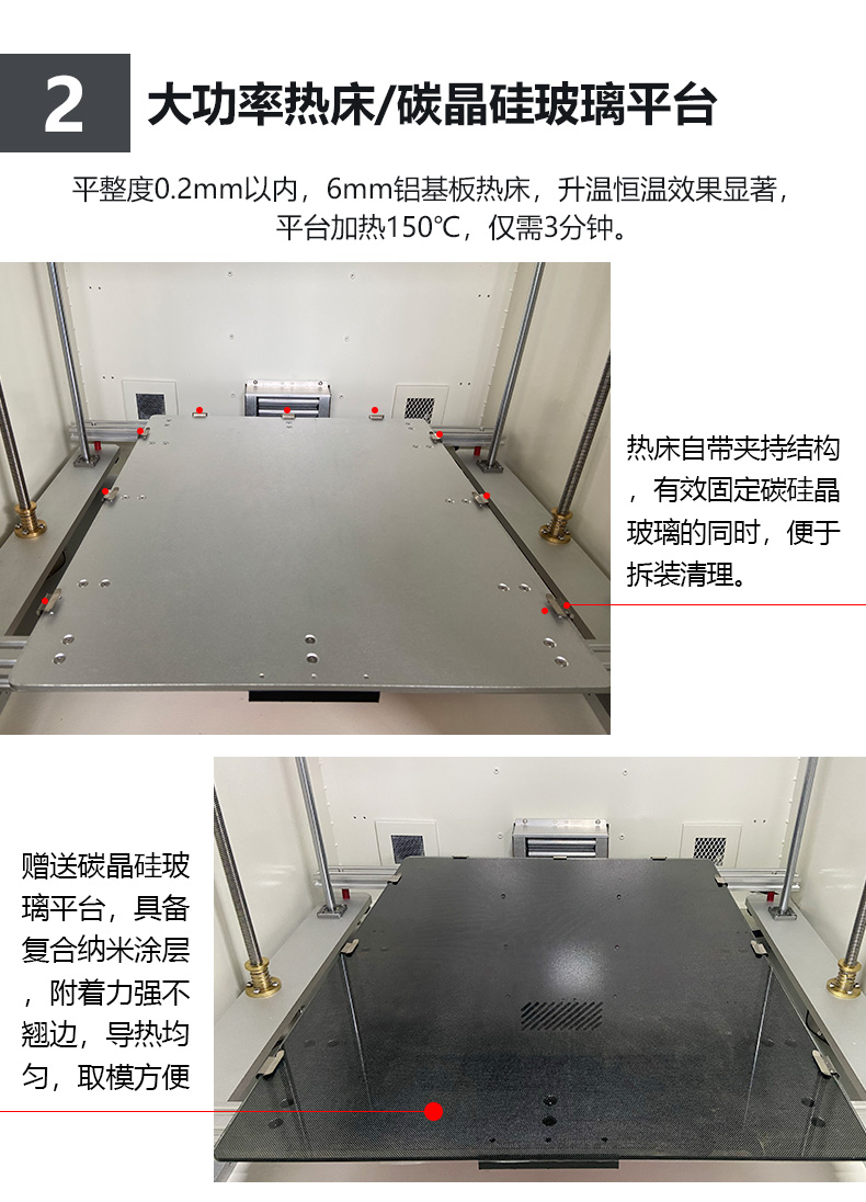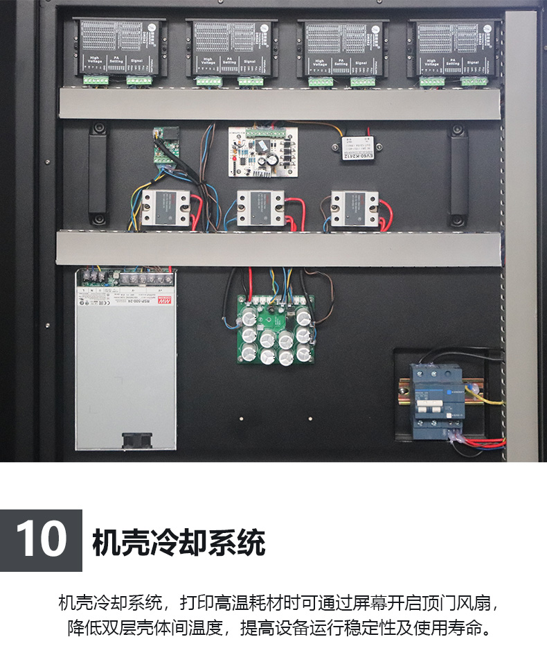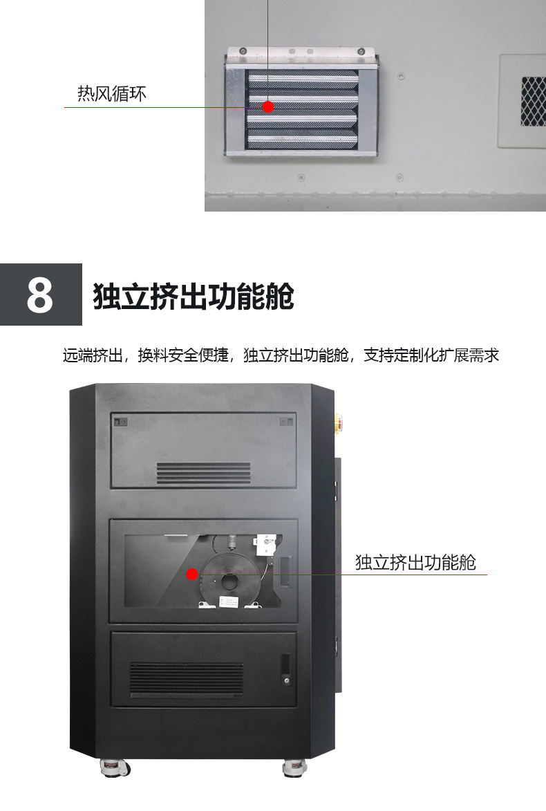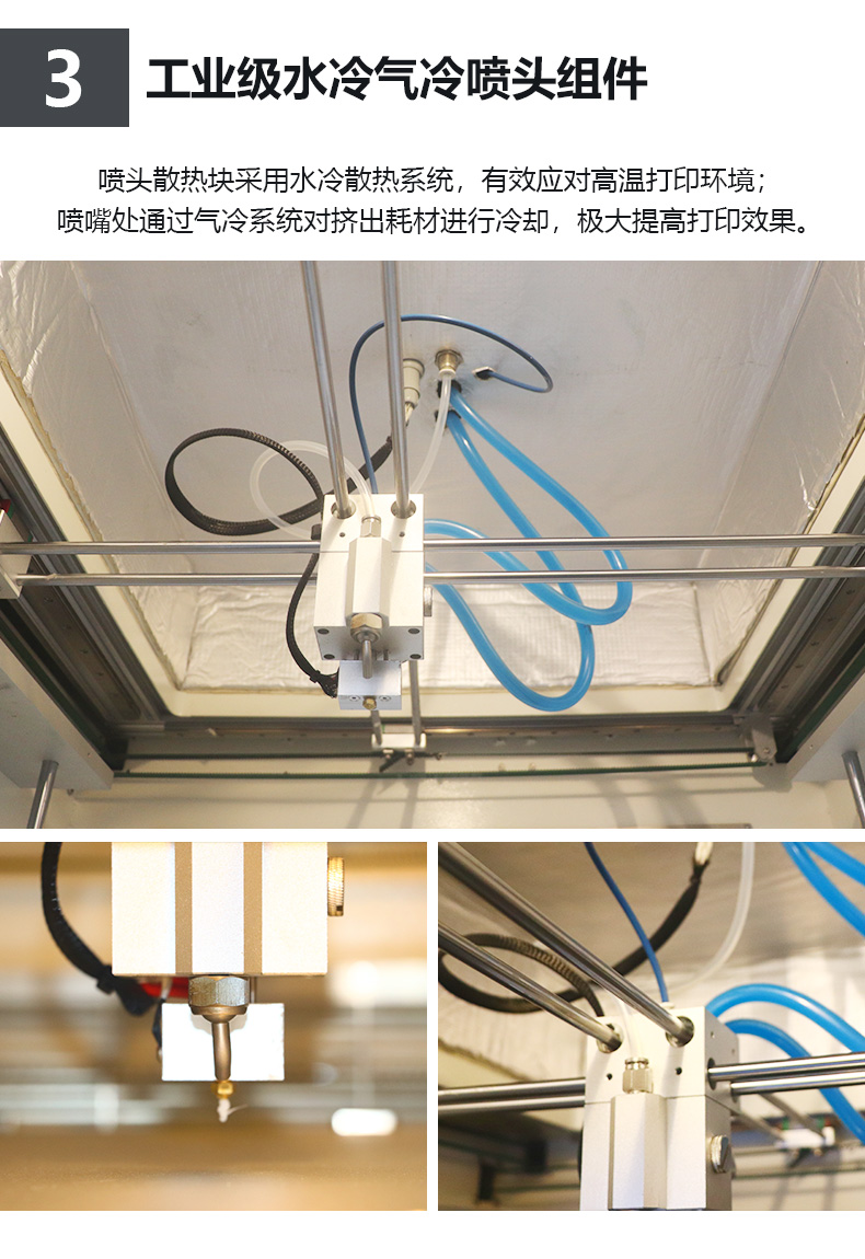 工業(yè)級 Sermoon-M1,成型尺寸:400X450X500mm;整機采用雙層機殼,保溫隔熱效果好;工業(yè)級水冷、氣冷二合一噴頭組件,不易堵頭,出絲順滑;定制電氣、傳動部件,滿足高溫環(huán)境下使用需求;恒溫耗材艙,可將耗材艙保持在10%-25%相對空氣濕度,避免耗材受潮、變脆易斷。